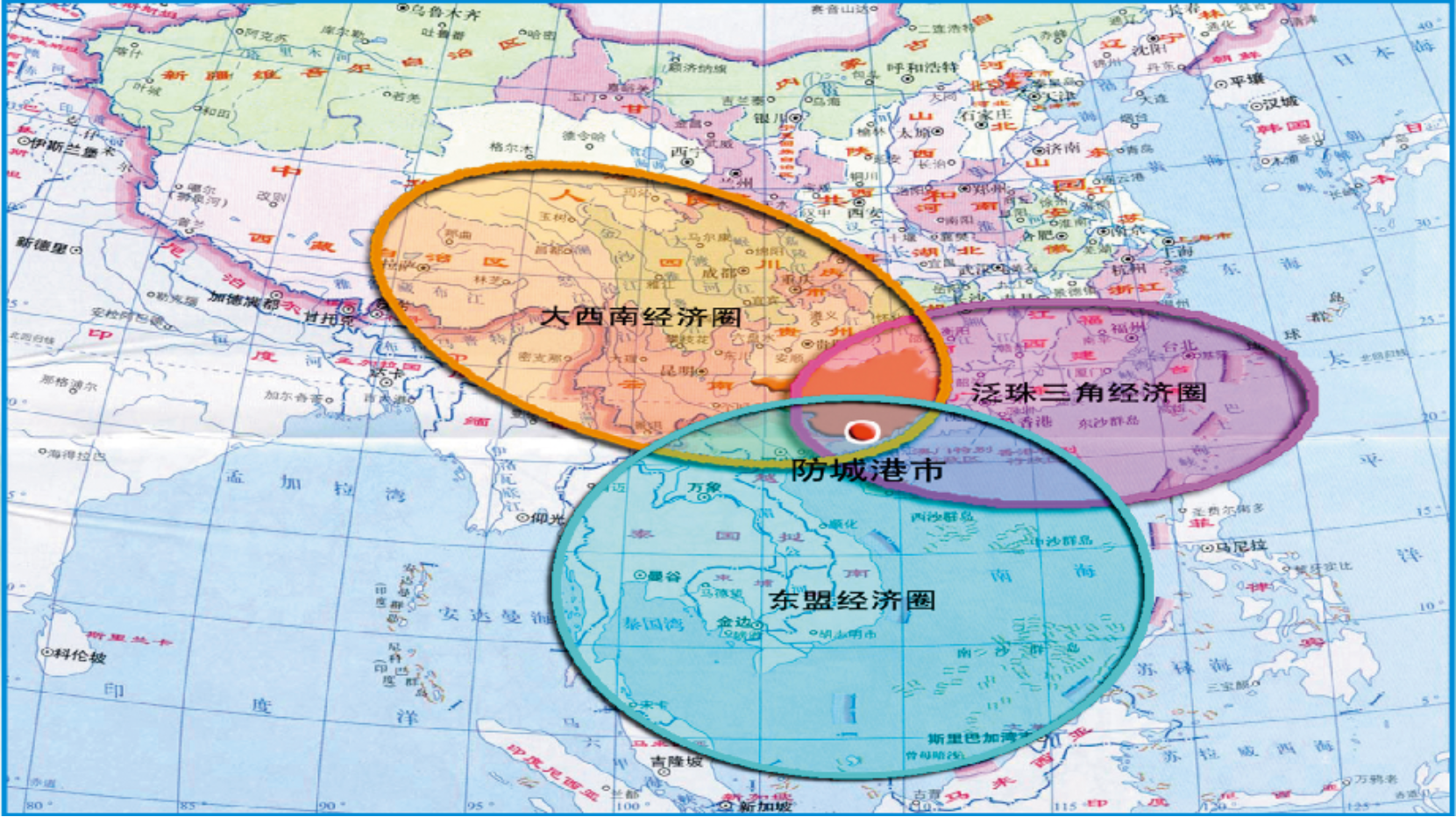 防城港市地处中国大陆海岸线的最西南端,是中国两个既沿海又沿边的城市之一,也是中国唯一与东盟海陆河相连的城市,位于RCEP覆盖区域核心位置,地处“一带一路”的重要节点,是泛珠三角经济圈、大西南经济圈、中国—东盟经济圈的交汇点,毗邻粤港澳,通东南亚,与东盟共挽,与大湾区相融,具有“一湾相挽11国、良性互动东中西”的独特区位优势。