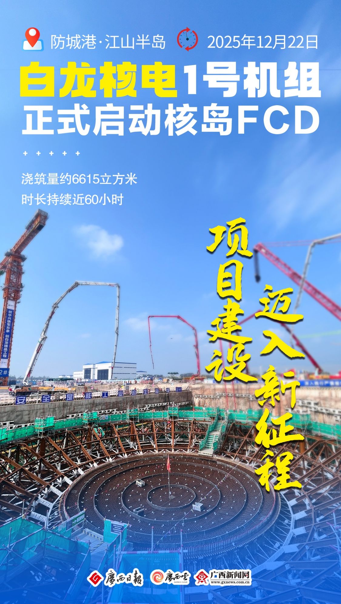 12月22日上午,广西白龙核电1号机组启动核岛第一罐混凝土浇筑(FCD),标志着国家电投在桂首个核电项目全面进入主体工程建设阶段。