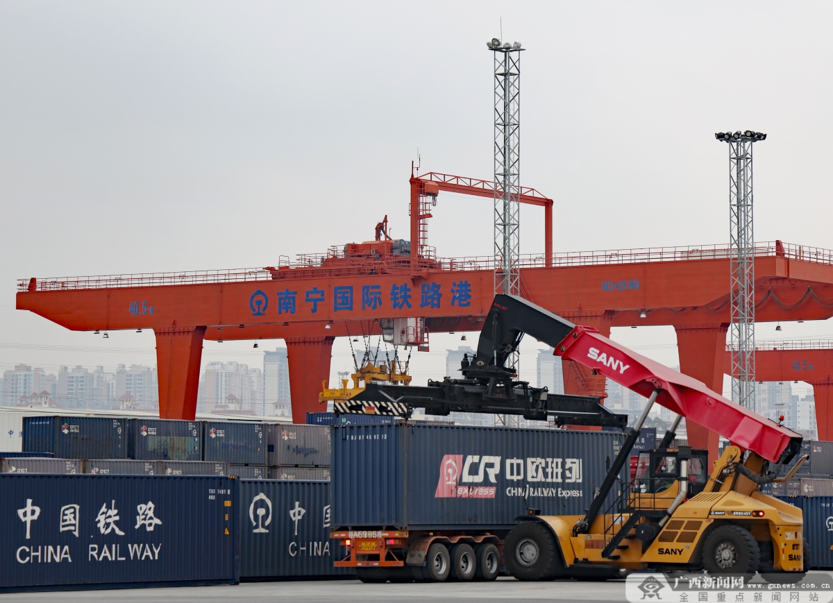 在南宁国际铁路港,集装箱装卸作业一派繁忙,全力保障年底物流通畅。广西云-广西日报记者 梁凯昌 摄