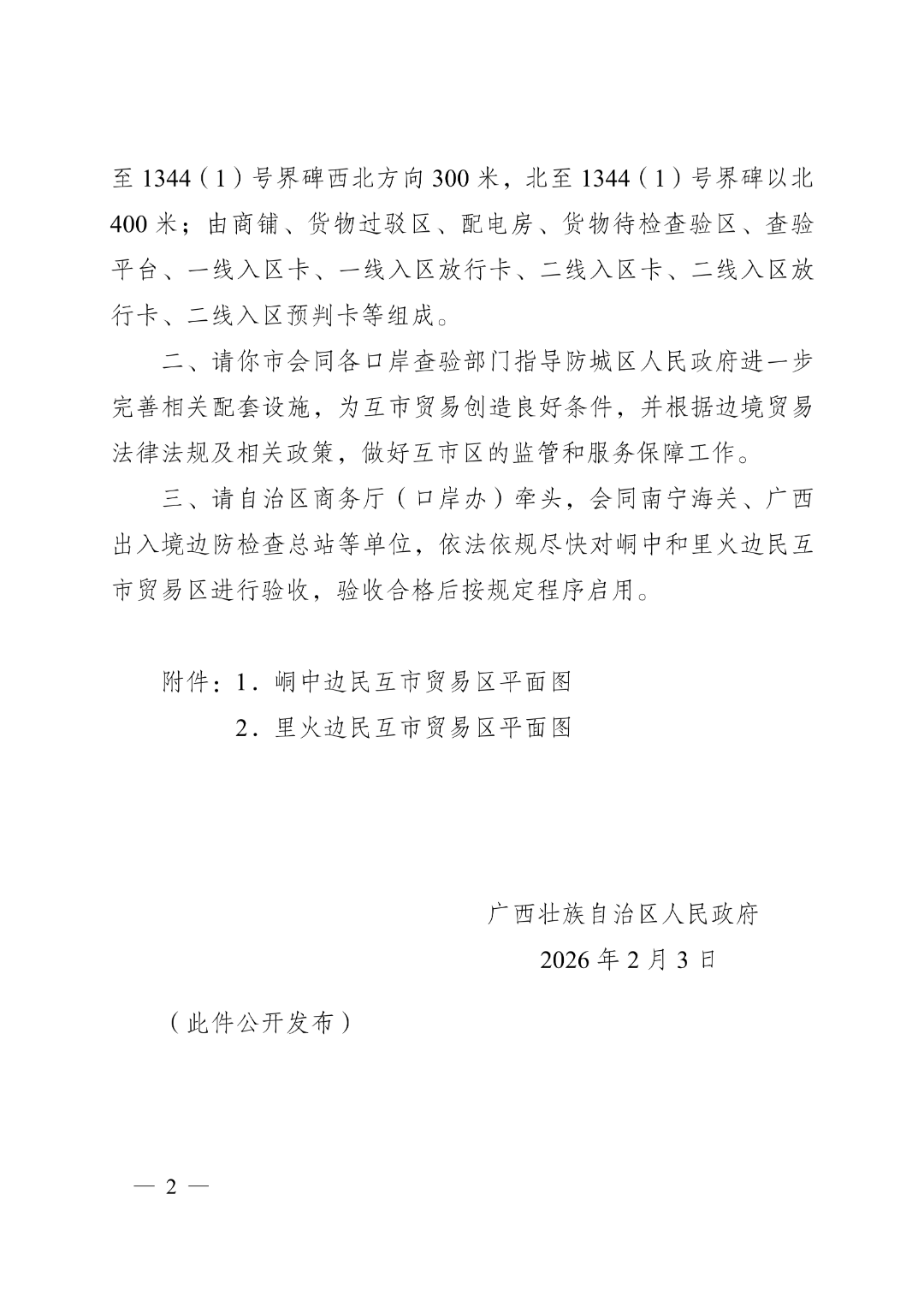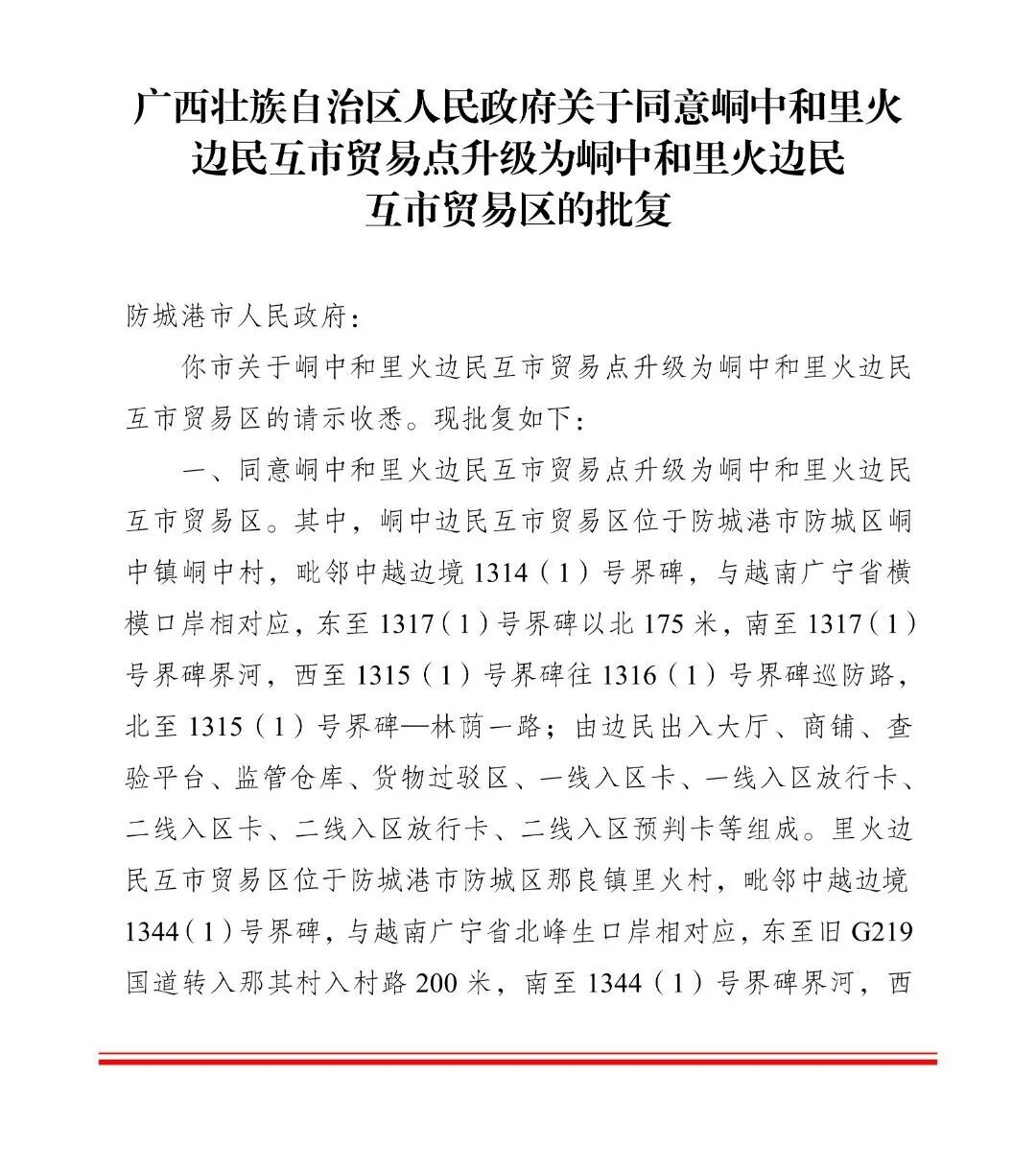 近日,广西壮族自治区人民政府发布了《广西壮族自治区人民政府关于同意峒中和里火边民互市贸易点升级为峒中和里火边民互市贸易区的批复》(桂政函〔2026〕20号),标志着防城港市边民互市贸易即将进入新发展阶段。