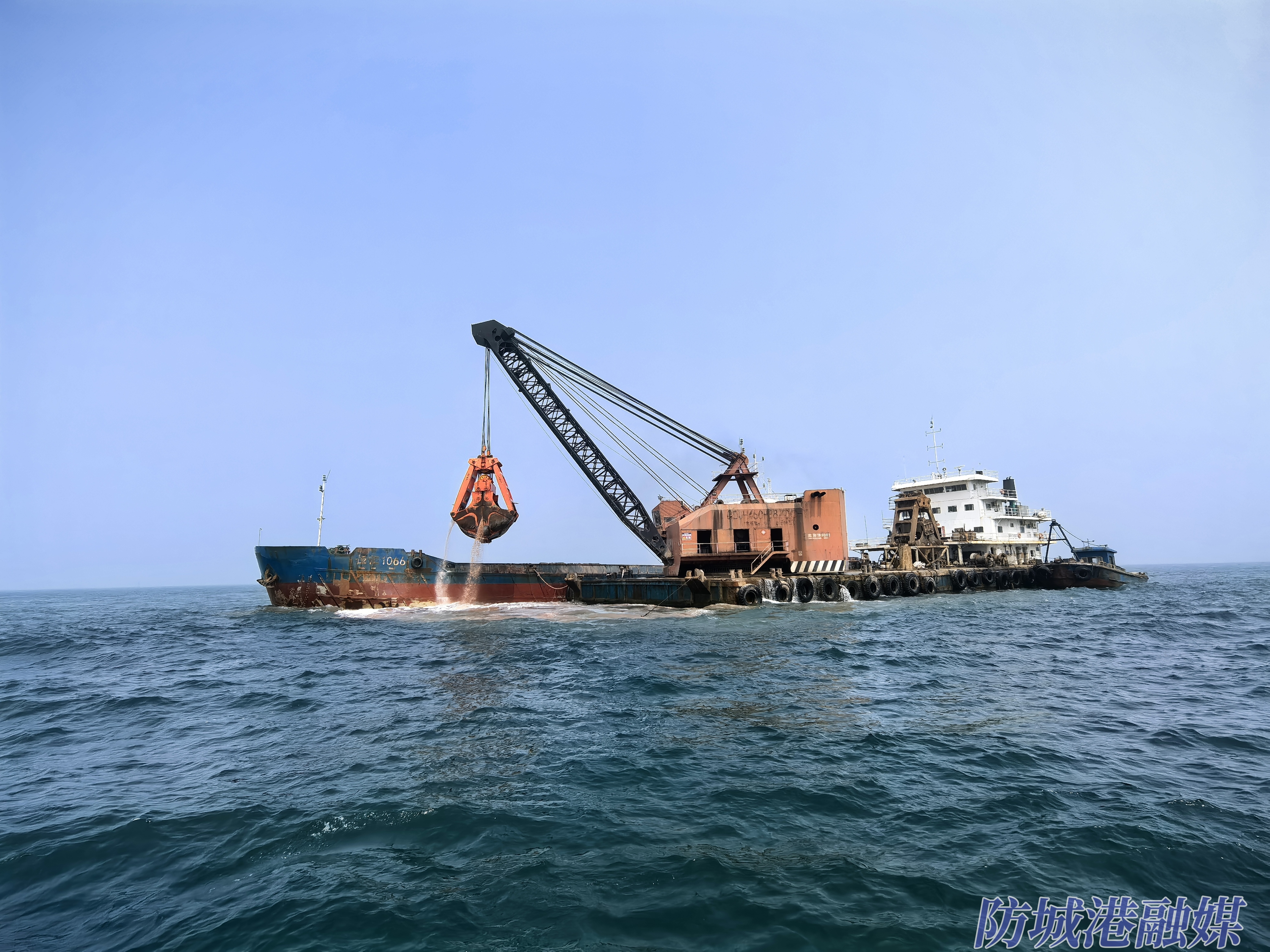 防城港港30万吨级进港航道工程(一期)I标段施工疏浚作业现场。