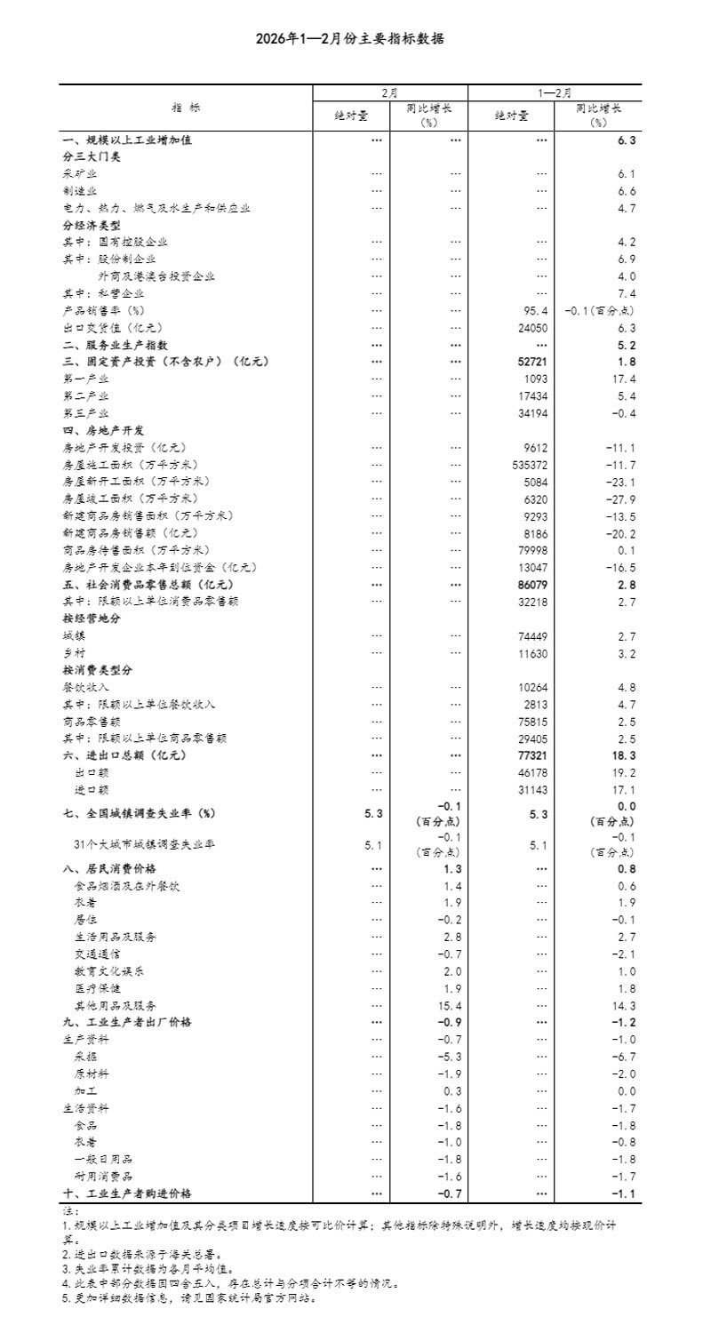 1—2月份,全国固定资产投资(不含农户)52721亿元,同比增长1.8%,上年全年为下降3.8%;扣除房地产开发投资,全国固定资产投资增长5.2%。分领域看,基础设施投资同比增长11.4%,制造业投资增长3.1%,房地产开发投资下降11.1%。全国新建商品房销售面积9293万平方米,同比下降13.5%;新建商品房销售额8186亿元,下降20.2%。分产业看,第一产业投资同比增长17.4%,第二产业投资增长5.4%,第三产业投资下降0.4%。民间投资同比下降2.6%,降幅比上年全年收窄3.8个百分点;扣除房地产开发投资,民间投资增长1.0%。高技术产业投资同比增长5.1%,其中航空、航天器及设备制造业,研发与设计服务业,信息服务业投资分别增长20.2%、20.6%、16.5%。从环比看,2月份固定资产投资(不含农户)比上月增长0.39%。