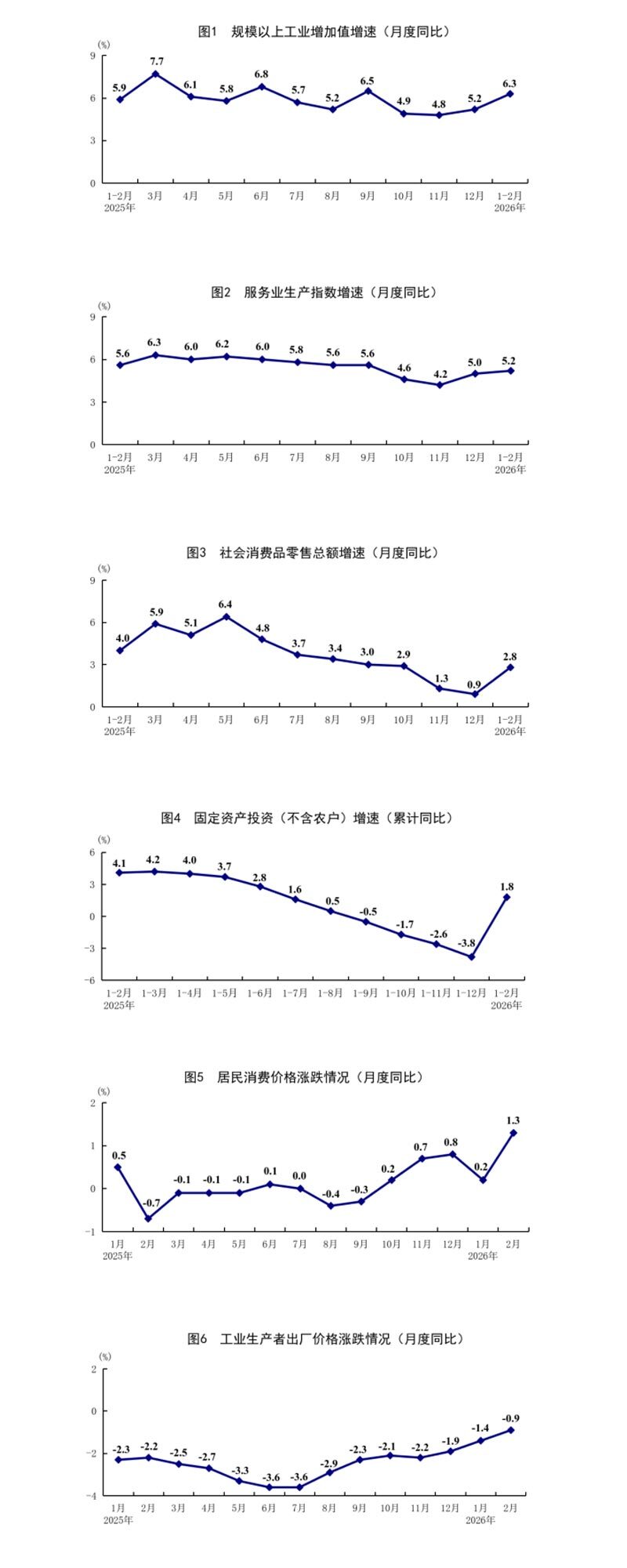 1—2月份,全国居民消费价格(CPI)同比上涨0.8%,其中1月份上涨0.2%,2月份上涨1.3%。分类别看,1—2月份,食品烟酒及在外餐饮价格同比上涨0.6%,衣着价格上涨1.9%,居住价格下降0.1%,生活用品及服务价格上涨2.7%,交通通信价格下降2.1%,教育文化娱乐价格上涨1.0%,医疗保健价格上涨1.8%,其他用品及服务价格上涨14.3%。在食品烟酒及在外餐饮价格中,猪肉价格下降11.2%,粮食价格下降0.2%,鲜果价格上涨4.5%,鲜菜价格上涨8.8%。扣除食品和能源价格后的核心CPI同比上涨1.3%。从环比看,1月份,全国居民消费价格上涨0.2%,2月份上涨1.0%。