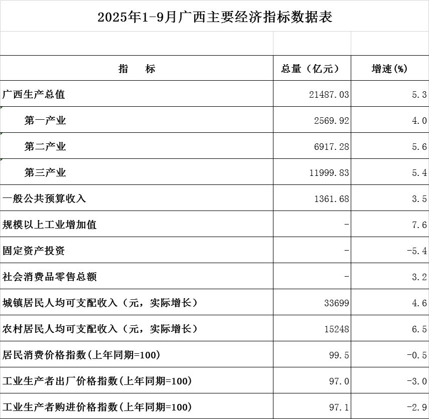 2025年1-9月广西主要经济指标数据表